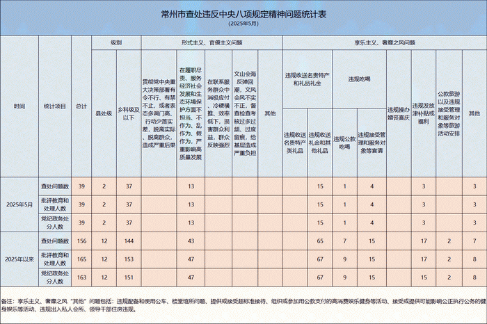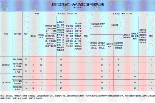 2025年5月,全市各级纪检监察机关共查处违反中央八项规定精神问题39起,从问题类型看,查处形式主义、官僚主义问题13起,查处享乐主义、奢靡之风问题26起。批评教育和处理39人,均给予党纪政务处分。从人员级别看,批评教育和处理县处级干部2人,乡科级及以下人员37人。