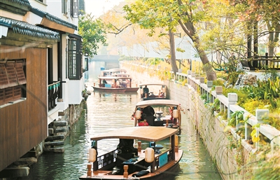 图为修缮后的江苏省苏州市姑苏区沧浪街道32号街坊的剪金桥巷河道,游客在体验全新水巷游。朱相冬 摄