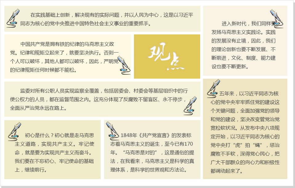 [胡福明]:我们党团结带领人民进行新的改革开放的伟大实践,破除阻碍国家和民族发展的一切思想和体制障碍,开辟了中国特色社会主义道路,使中国大踏步赶上时代。用习近平总书记的话说,就是“中华民族迎来了从站起来、富起来到强起来的伟大飞跃,迎来了实现中华民族伟大复兴的光明前景”。贯穿始终的,是将马克思主义与中国实际相结合的指导思想,坚持以人民为中心,坚持中国共产党的领导是中国特色社会主义最本质的特征。 党的建设是以习近平同志为核心的党中央在党的十八大以来推进各项事业的重要抓手。五年来,以习近平同志为核心的党中央牢牢抓住党的建设这个关键问题,全面加强党的领导和党的建设,坚决改变管党治党宽松软状况。从发布中央八项规定开始,以习近平同志为核心的党中央打“虎”拍“蝇”,惩治腐败不手软,深得党心民心,把广大干部群众的向心力和积极性都调动起来了。大家都跟着习近平总书记走,总书记的威望非常高。 列宁曾反复强调,党的纪律是铁的纪律。中国共产党是拥有铁的纪律的马克思主义政党。纪律和规矩立起来了,就要坚决执行。否则一个人可以破坏,其他人都可以破坏,因此,严明党的纪律规矩任何时候都不能松。现在正在深化的一项事关全局的重大政治体制改革,就是成立监委。监委对所有公职人员实现监察全覆盖,包括居委会、村委会等基层组织中的行使公权力的人员,都在监督范围之内。这充分体现了反腐败不留盲区、永不停步,全面从严治党永远在路上。 |