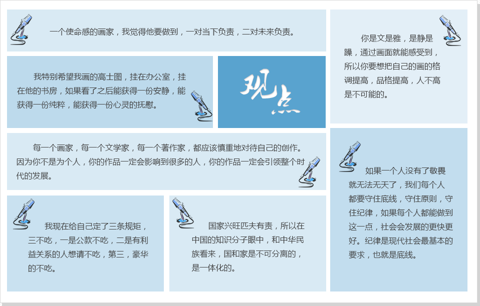 [主持人]:中华文化一贯重视做人的道理,其实在艺术界都流传着这样的话,要想画好画一定要先做好人。我们回归到中华文化的做人的道理上,到最后都会落实到做人上面,这个道理对我们今天的道德建设带来了哪些启迪呢?您是怎么理解的? |