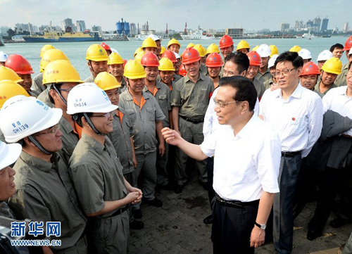 4月11日,李克强在海口港码头了解港口吞吐量及发展规划等情况。这是李克强与码头工人交谈。(刘建生 摄)