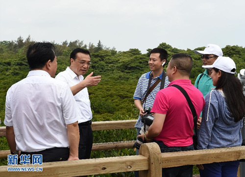 4月11日,李克强在海口东寨港红树林湿地保护区考察生态环保工作。这是李克强与游客交谈。(刘建生 摄)