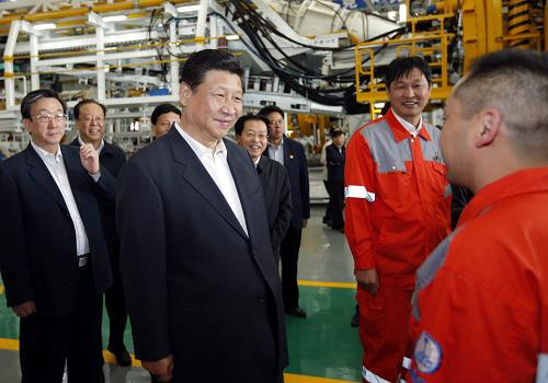 5月9日至10日,中共中央总书记、国家主席、中央军委主席习近平在河南省考察工作。这是5月10日上午,习近平在中铁工程装备集团有限公司盾构总装车间同现场职工亲切交流。(新华社记者 鞠鹏 摄)