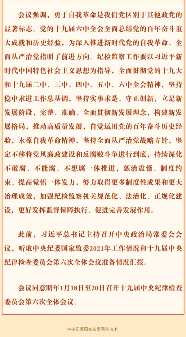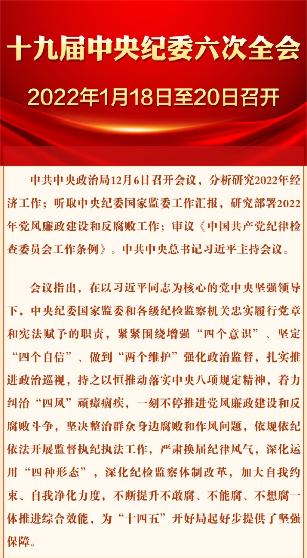 十九届中央纪委六次全会2022年1月18日至20日召开