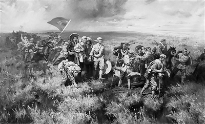 油画《红军过草地》。长征中,红军高举旗帜,在恶劣的环境中英勇前进。
