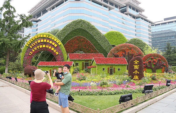 2021年6月,庆祝中国共产党成立100周年主题花坛亮相长安街沿线,西单东南角的全面小康主题花坛吸引市民驻足留影。 (图片来源:人民视觉)