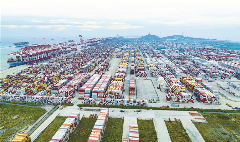 上海港洋山港区集装箱吞吐作业繁忙有序,多艘超大型集装箱货船正在进行装卸作业。图片来源:视觉中国