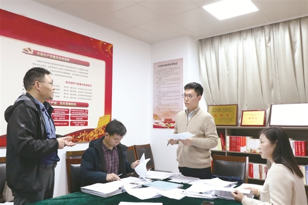 12月5日,江苏省南京市纪委监委有关监督检查室会同派驻纪检监察组、以案促改专项小组等赴市水务局,围绕纪检监察建议整改落实情况开展调研。图为工作人员查阅整改台账。黄邹文姣 摄