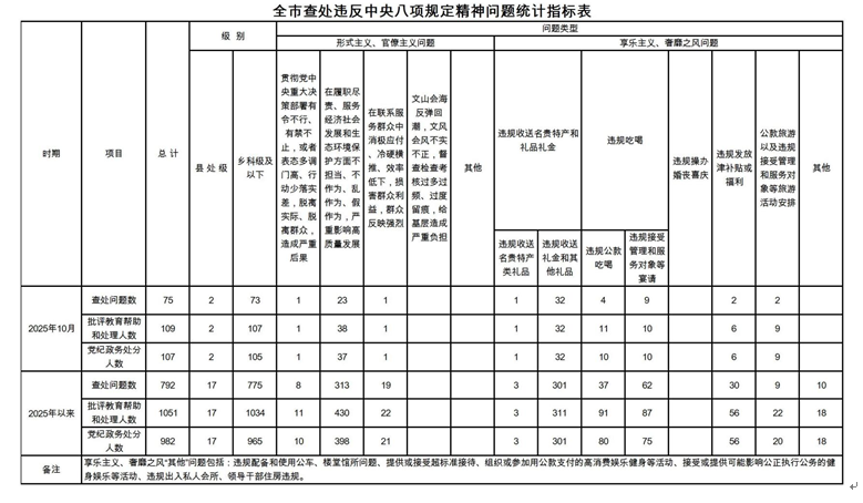 为掌握全市贯彻落实中央八项规定精神情况,盐城市纪委在各县(市、区)、市级机关、市属单位建立了落实中央八项规定精神情况月报制度。2025年以来,截至10月31日,全市查处违反中央八项规定精神问题情况如下: