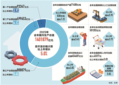 “中国经济又一次在爬坡过坎中实现全年5%的增长,完成了年初确定的目标。特别是2025年国内生产总值首次站上140万亿元的新高度,这不仅是一年来的成绩,更是整个‘十四五’时期的收官成果。”清华大学中国发展规划研究院常务副院长董煜说,在各种风险挑战交织的背景下,这份成绩单来之不易。