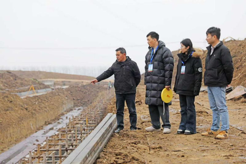 金湖县纪委监委坚持“查改治”一体推进,强化办案引领,深化以案促改,推进系统治理,以有力监督护航高标准农田建设。图为该县纪检监察干部在戴楼街道小集村高标准农田建设项目施工现场了解相关情况。(邵传雯 摄)