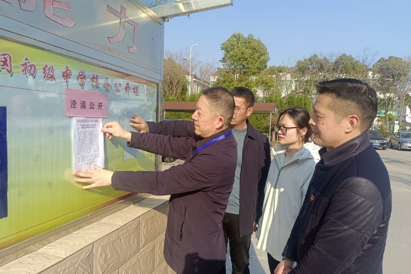 盐都区纪委监委第二派驻纪检监察组工作人员在公告栏张贴通报澄清材料。(黄宝玉 摄)