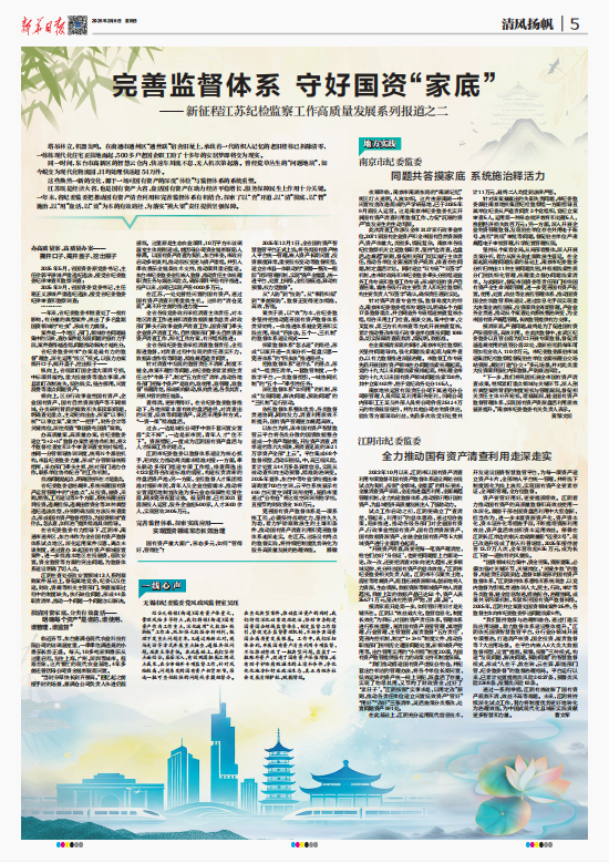 完善国有资产监督体系是一项系统工程,必须保持战略定力,坚持久久为功,着力铲除腐败滋生的土壤和条件,推动国有资产清查利用和完善监督体系走深走实。在江苏,这场没有终点的监督实践,将持续把制度优势转化为服务高质量发展的治理效能。